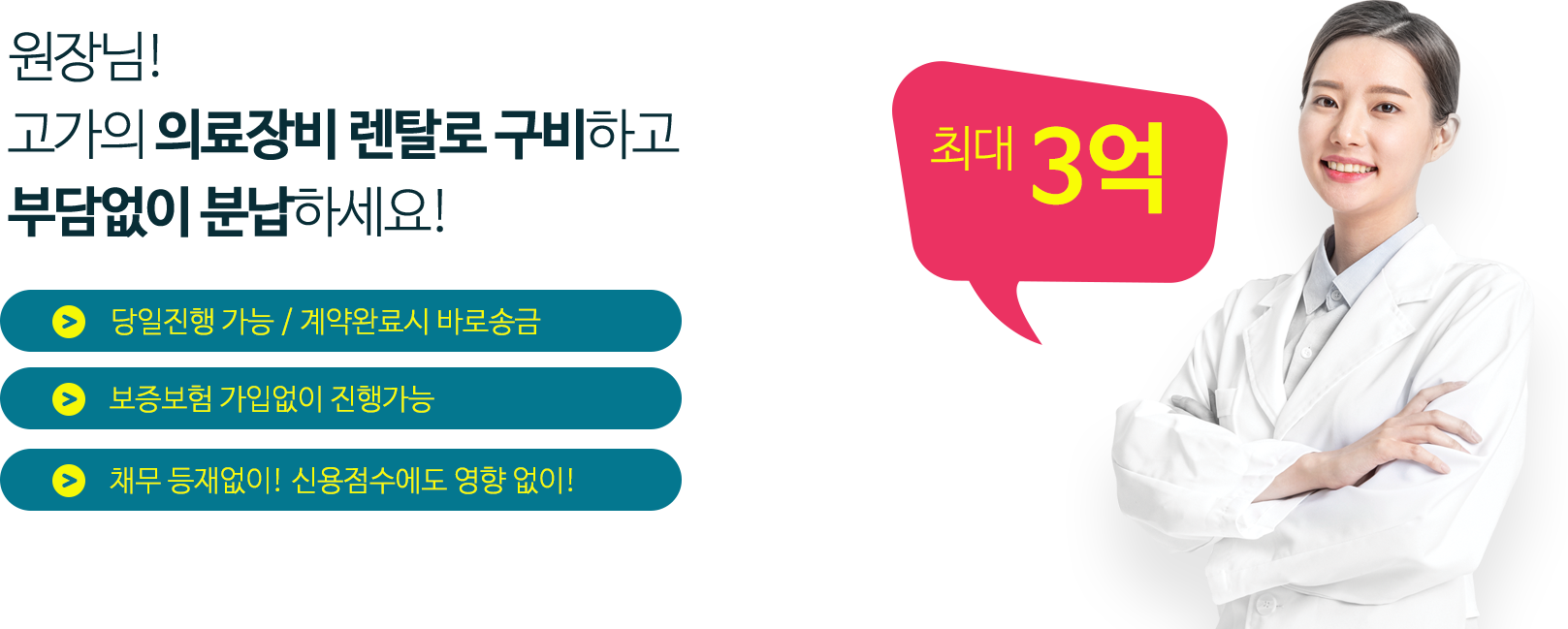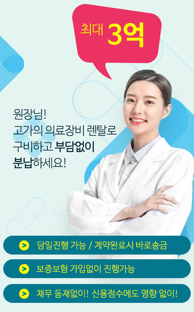 의료기기나 장비에 따라 최대 금액 3억까지 일시금으로 확보할 수 있게 진행 가능합니다.